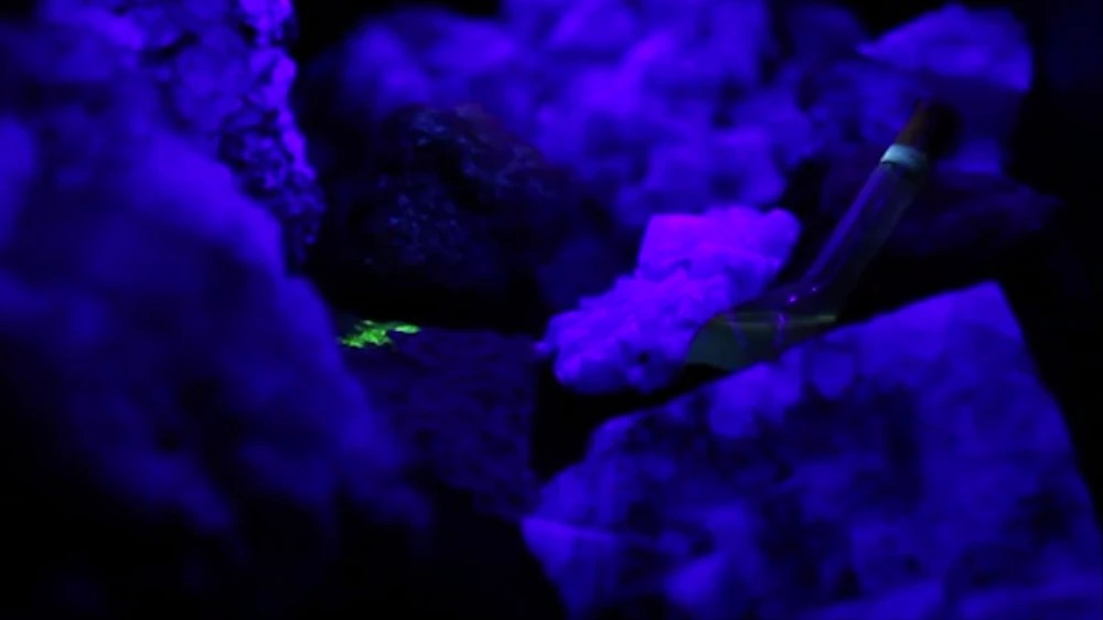 The two 15-minute sonifications were paired with visuals crafted by blasting ultraviolet light onto fluorescent minerals and ores, such as fluorspar and uranium ore. Pitchblende and fluorospar samples were lent to the project by Colin Laidler an ex-miner who had interesting collections of minerals. The fluorescent elements of the minerals and ore flicker and pulsate under the UV light, creating complex harmonics and spatial placement dictated by the data collected during the expedition into the Stanhope mine.